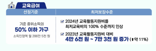의료급여와 교육급여의 경우 기준 중위 소득이 상승했지만, 선정 기준은 기존과 동일하게 유지됩니다. 그러나 교육급여에서 교육활동지원비가 최저교육비의 100% 수준까지 인상되어 올해보다 11% 증가했기 때문에, 학생들은 4만 6천원에서 7만 3천 원까지 더 받게 됩니다.